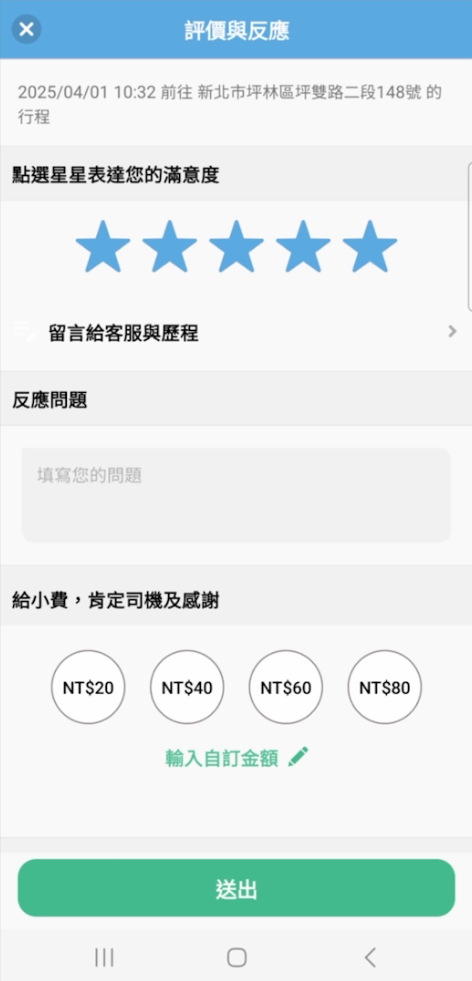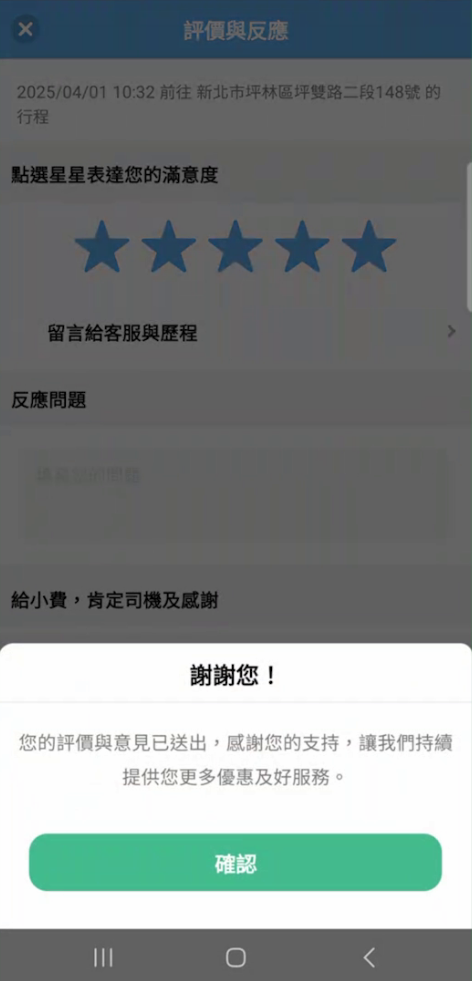 5. 到達目的地,收到付款成功通知或下車,就可評分司機